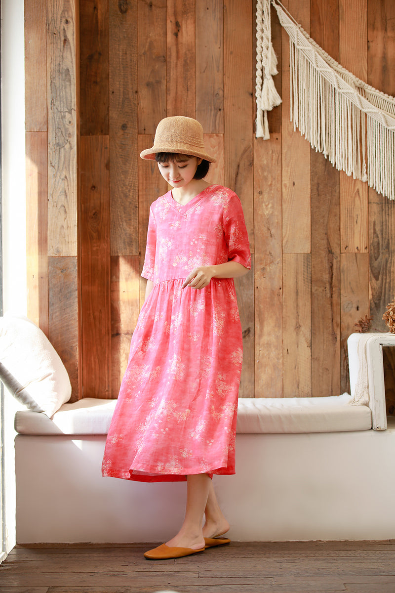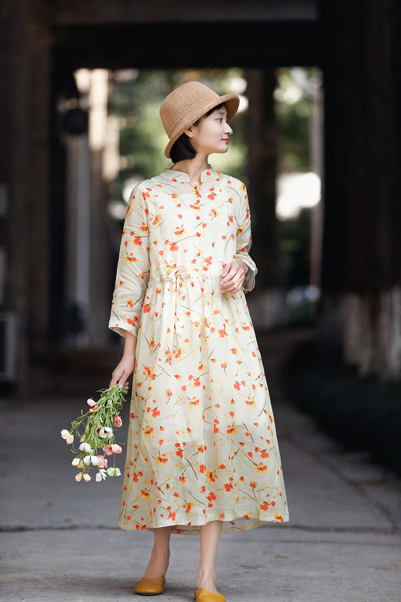 选用了天丝麻材质,更亲肤更舒适,颜色饱和度非常好全棉里布做了内衬,免去打底的麻烦后背小心机,后背开扣选用同色系的扣子装饰,蝶恋花的手工刺绣,让衣服美上加美裙子设计是V领,显脖子长,拉伸线条。特别加配了同色系的腰带。系带修身显瘦,两侧有口袋