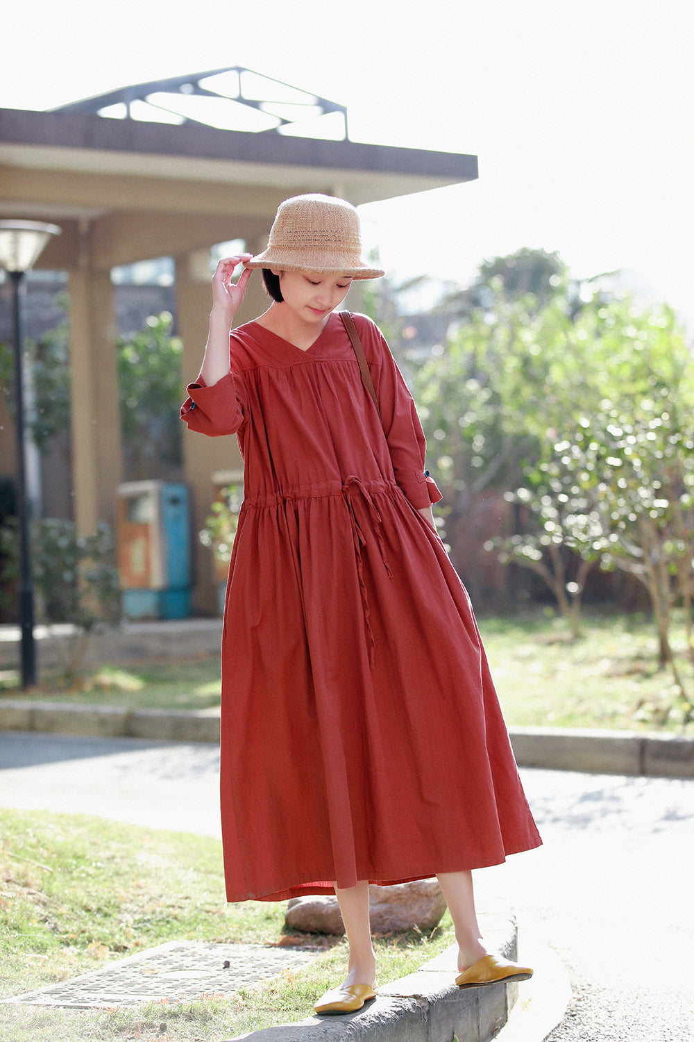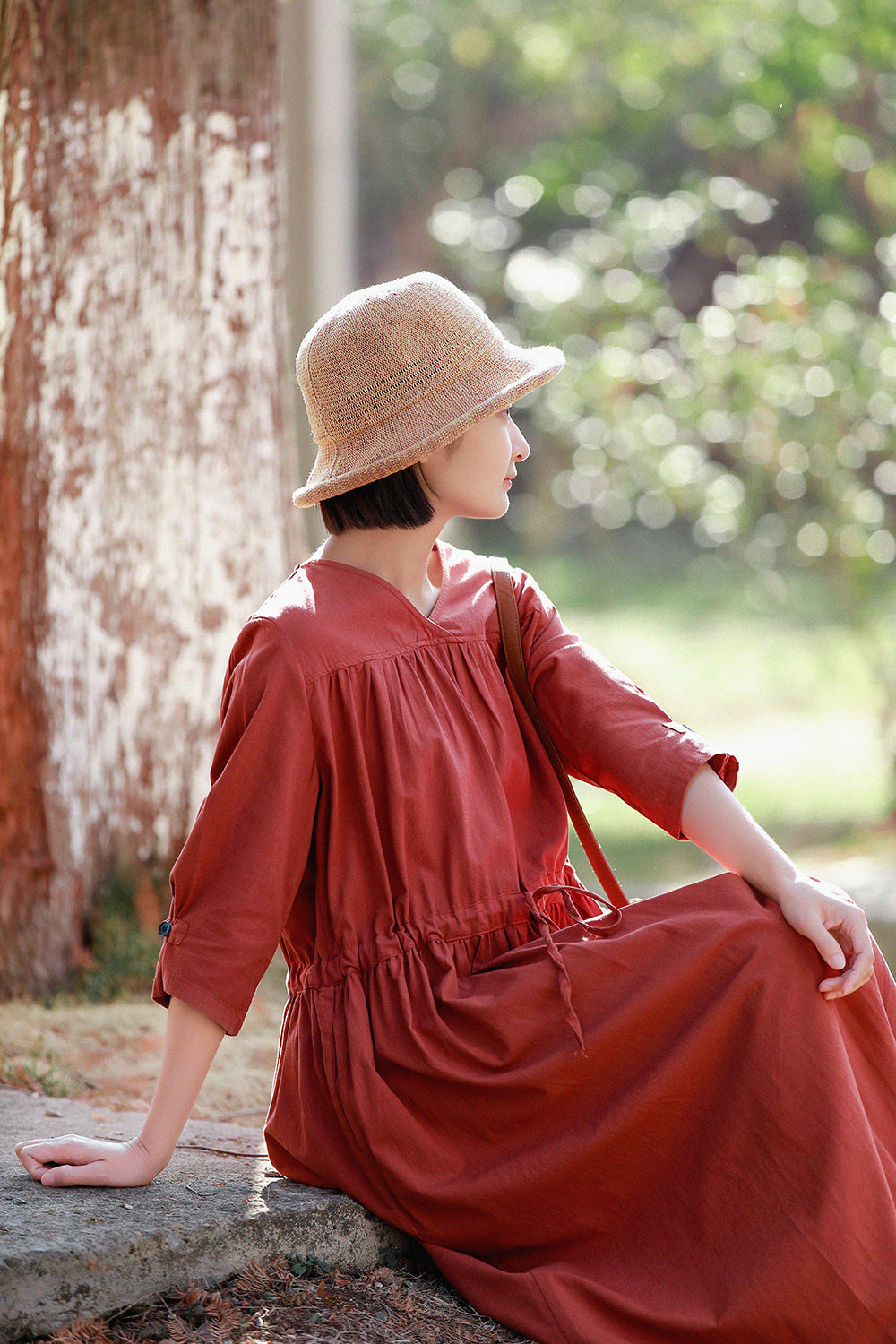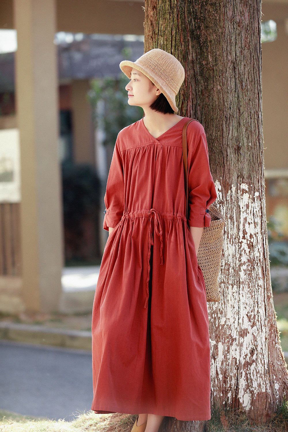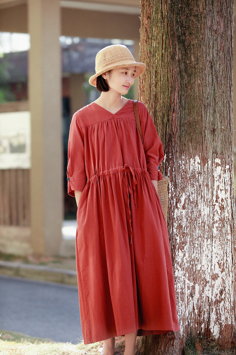 文艺棉麻系带连衣裙宽松大码长裙MM068