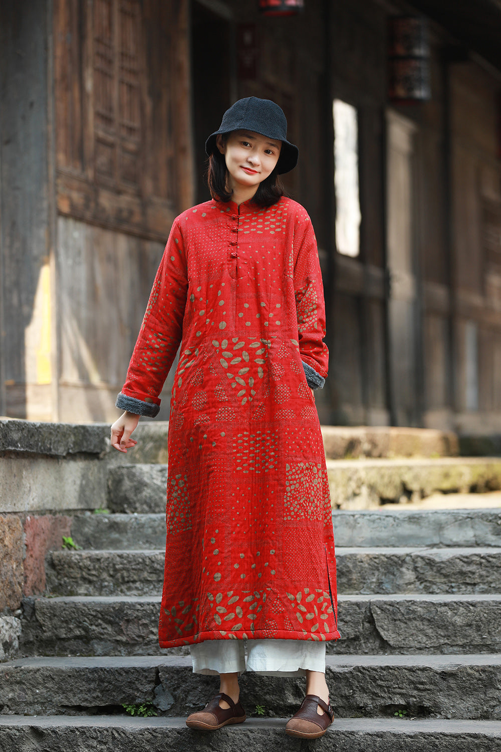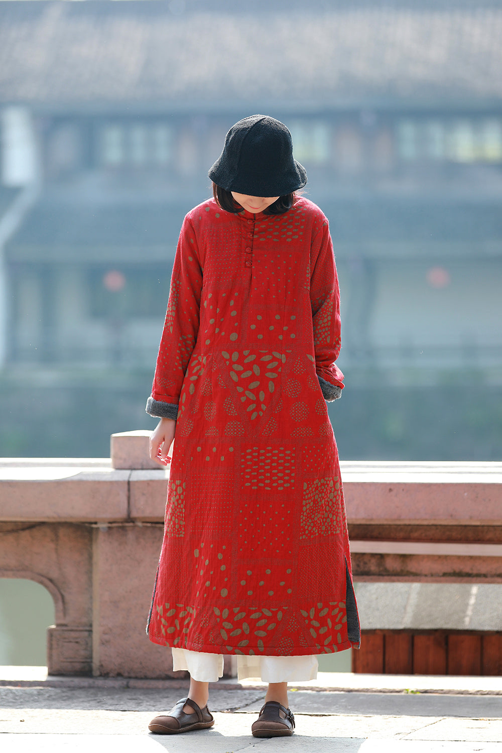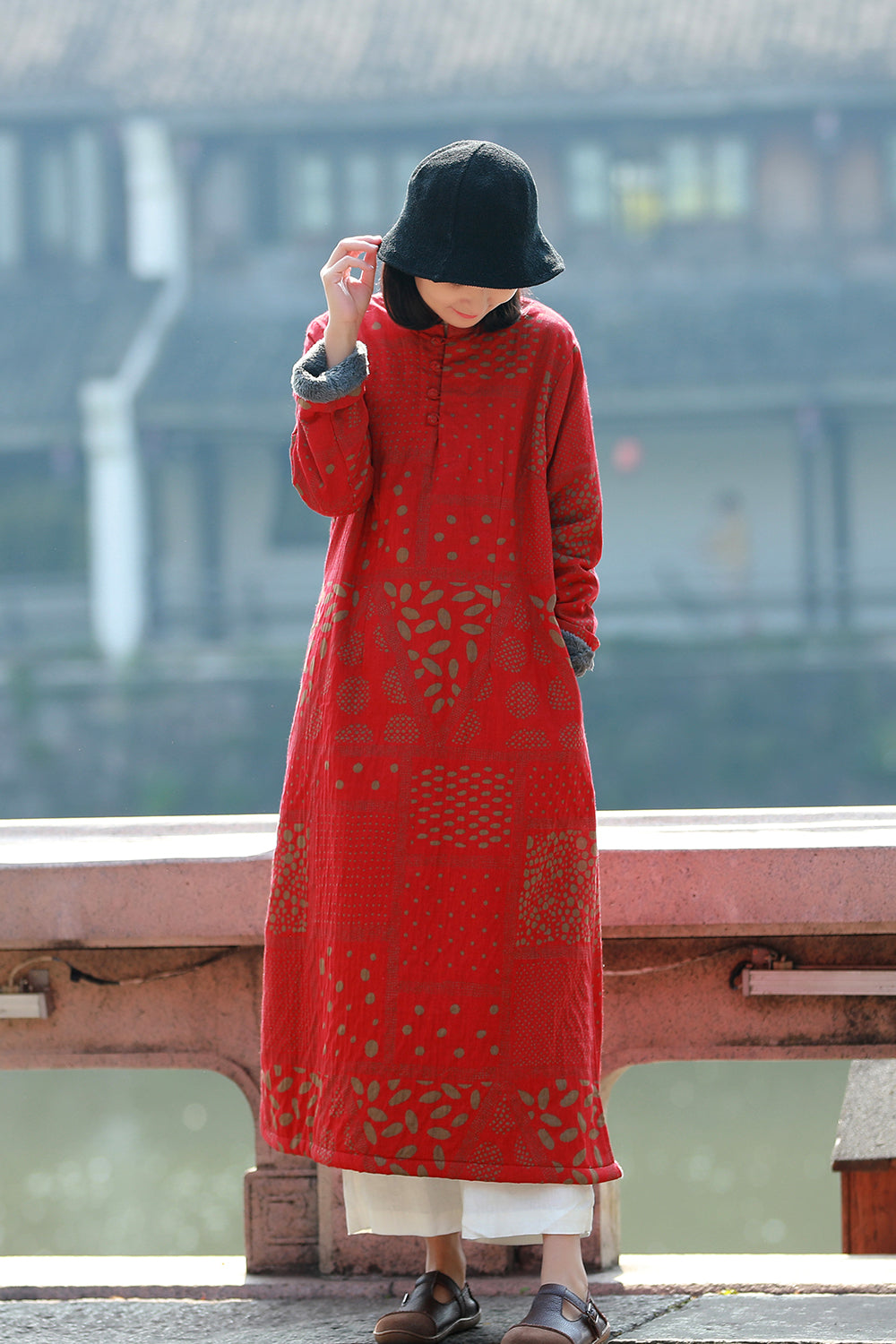 立領長款旗袍復古的印花總是那麼適合做旗袍,衣長適中,穿著更加日常,下擺微A型,沉穩中帶點小俏皮