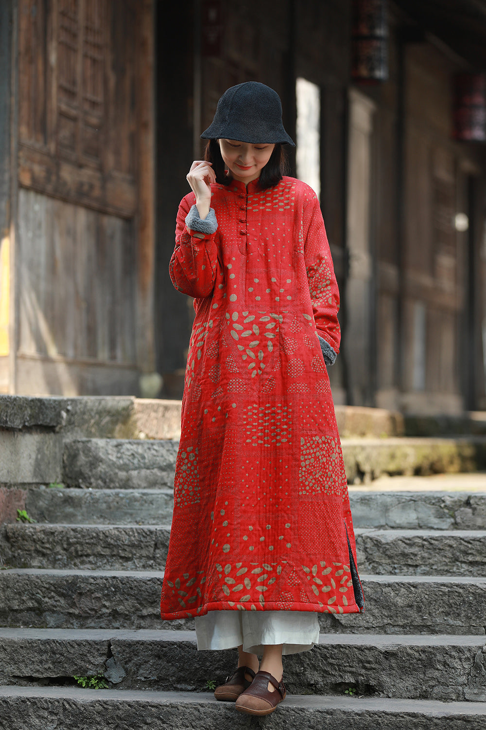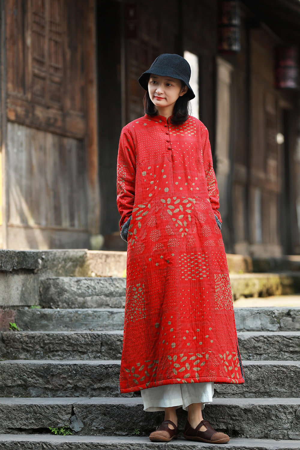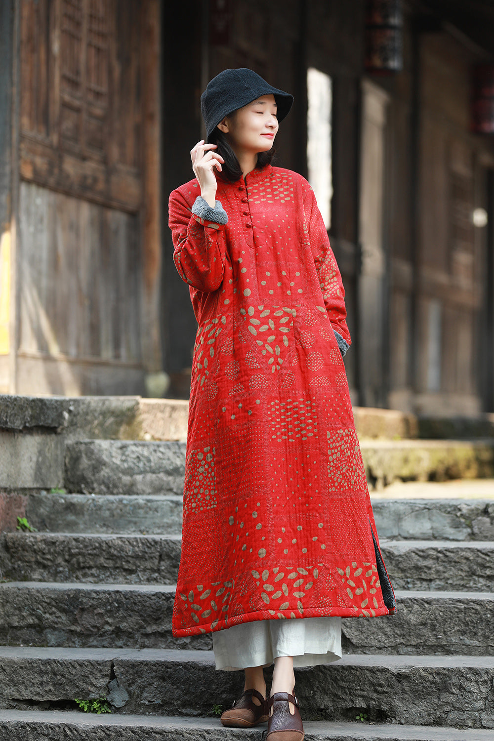 立領長款旗袍復古的印花總是那麼適合做旗袍,衣長適中,穿著更加日常,下擺微A型,沉穩中帶點小俏皮