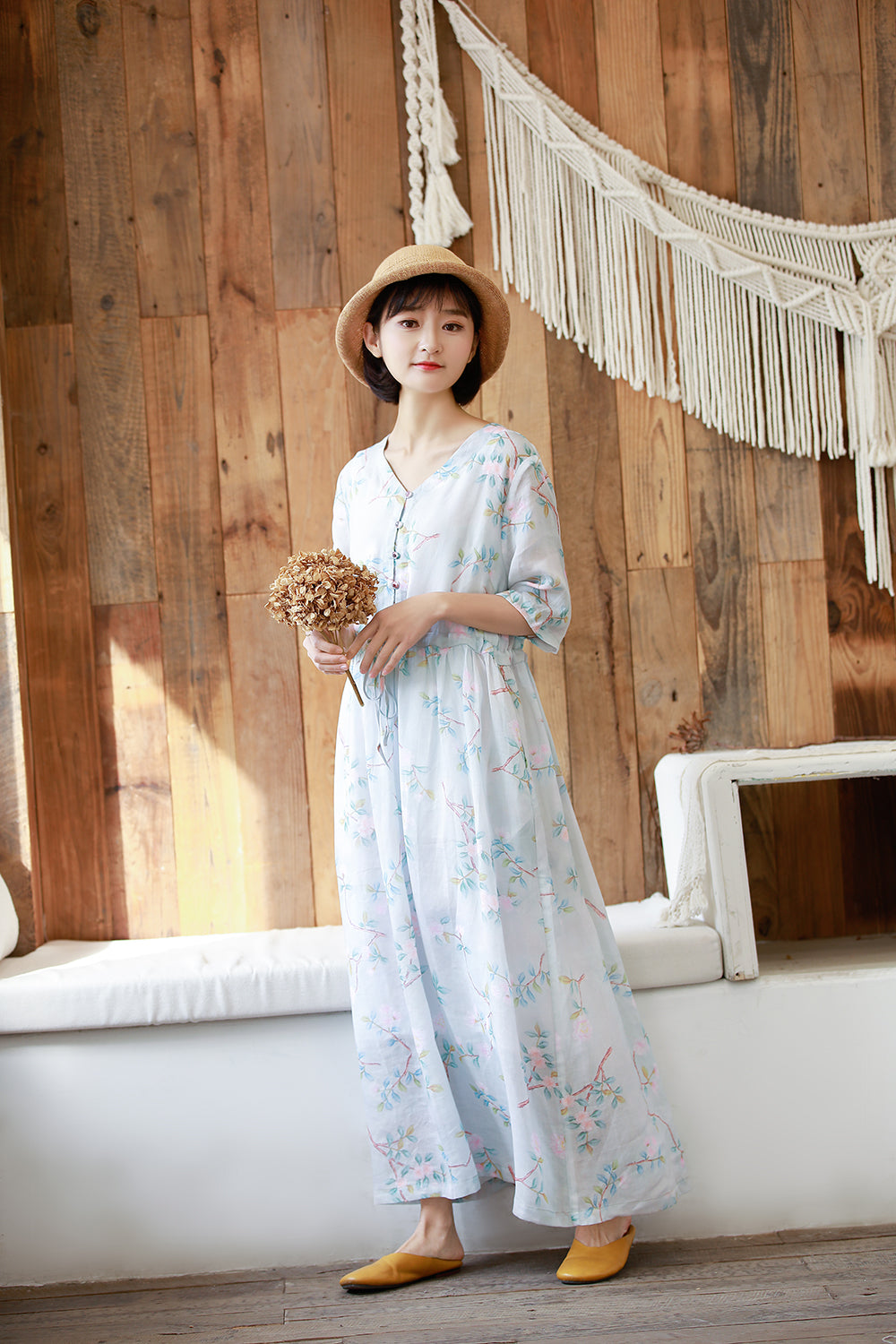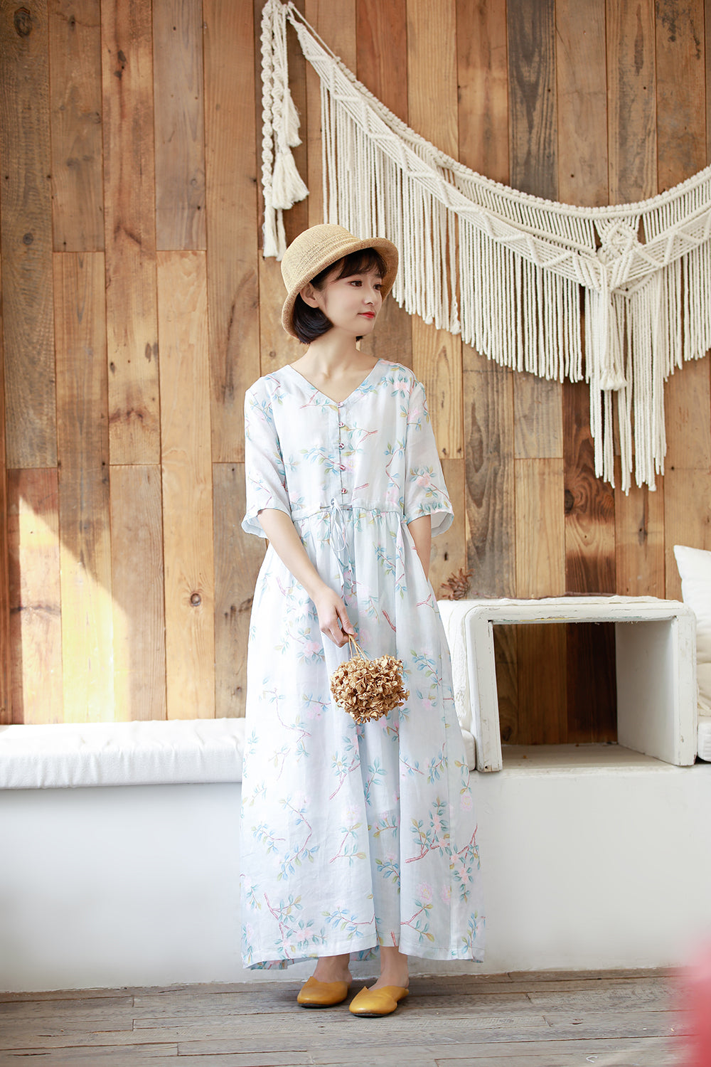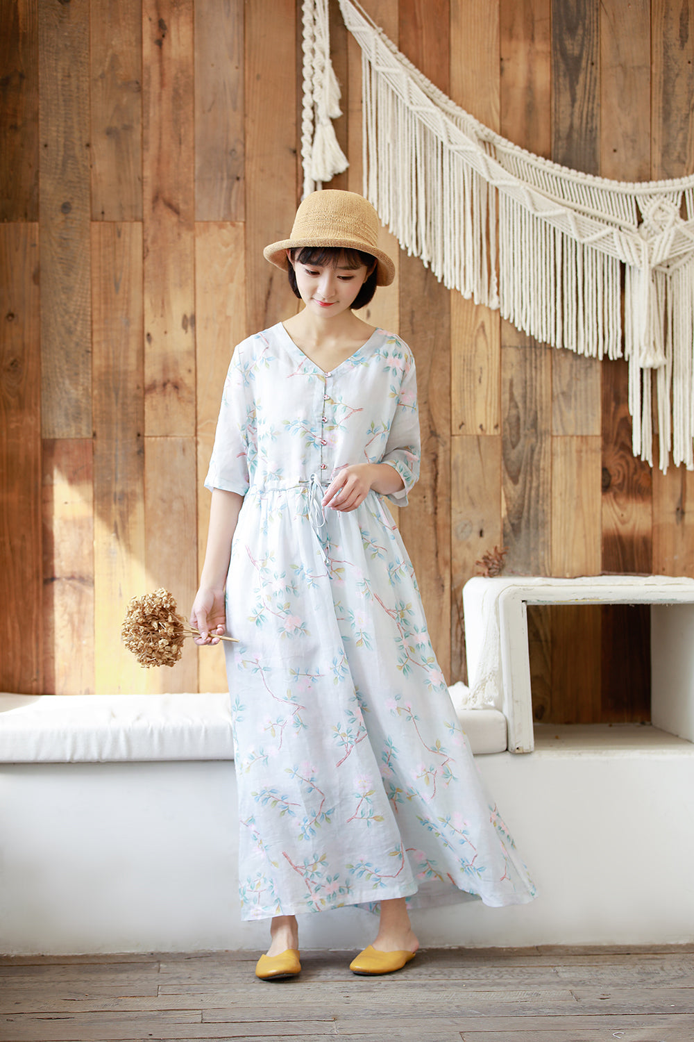 顏色:浅蓝尺碼:M/L面料:亞麻糢特身高:160cm體重:45kg