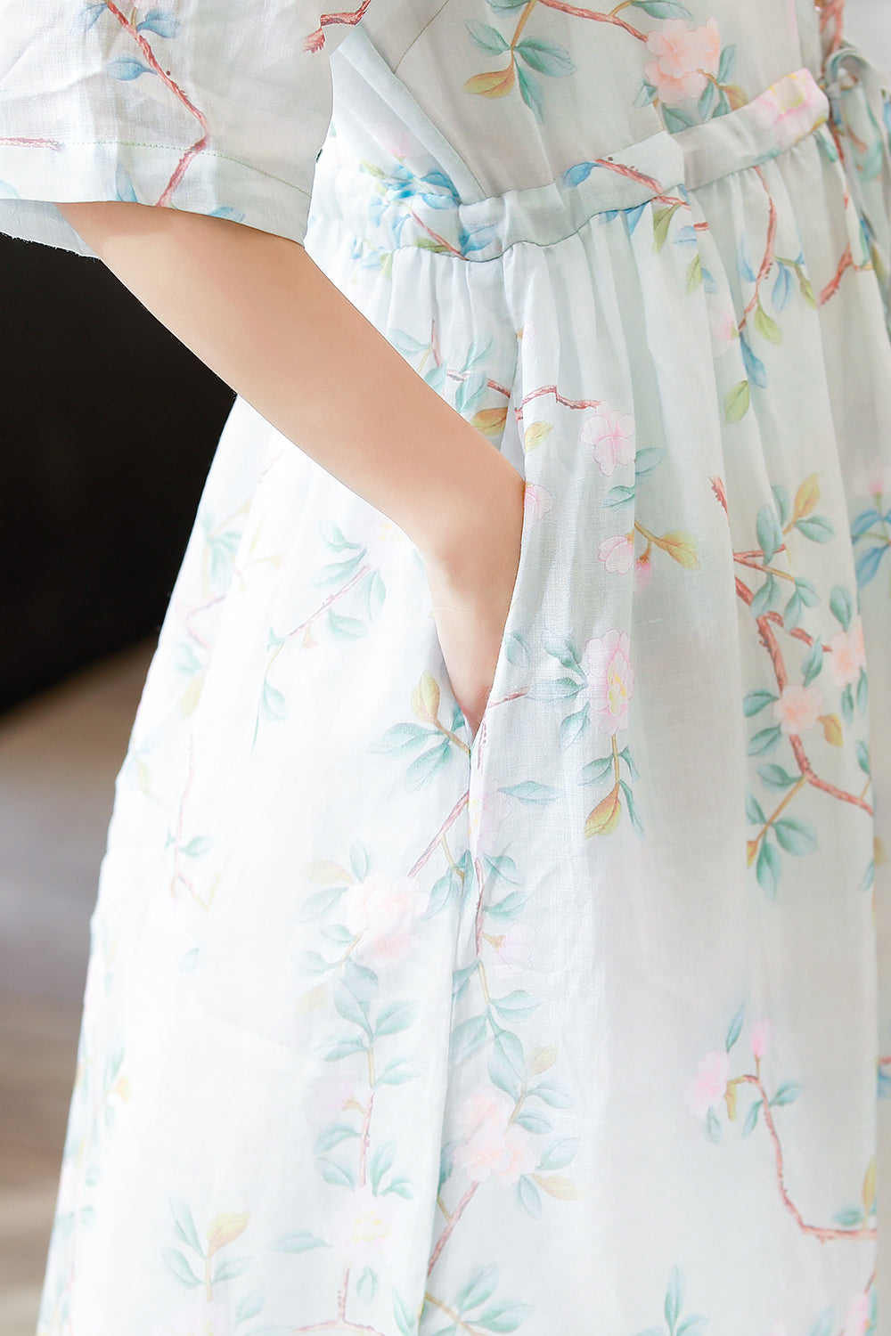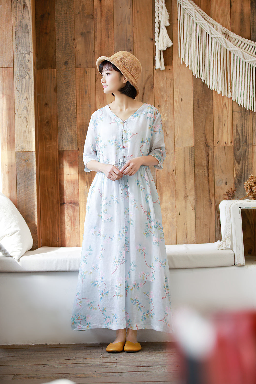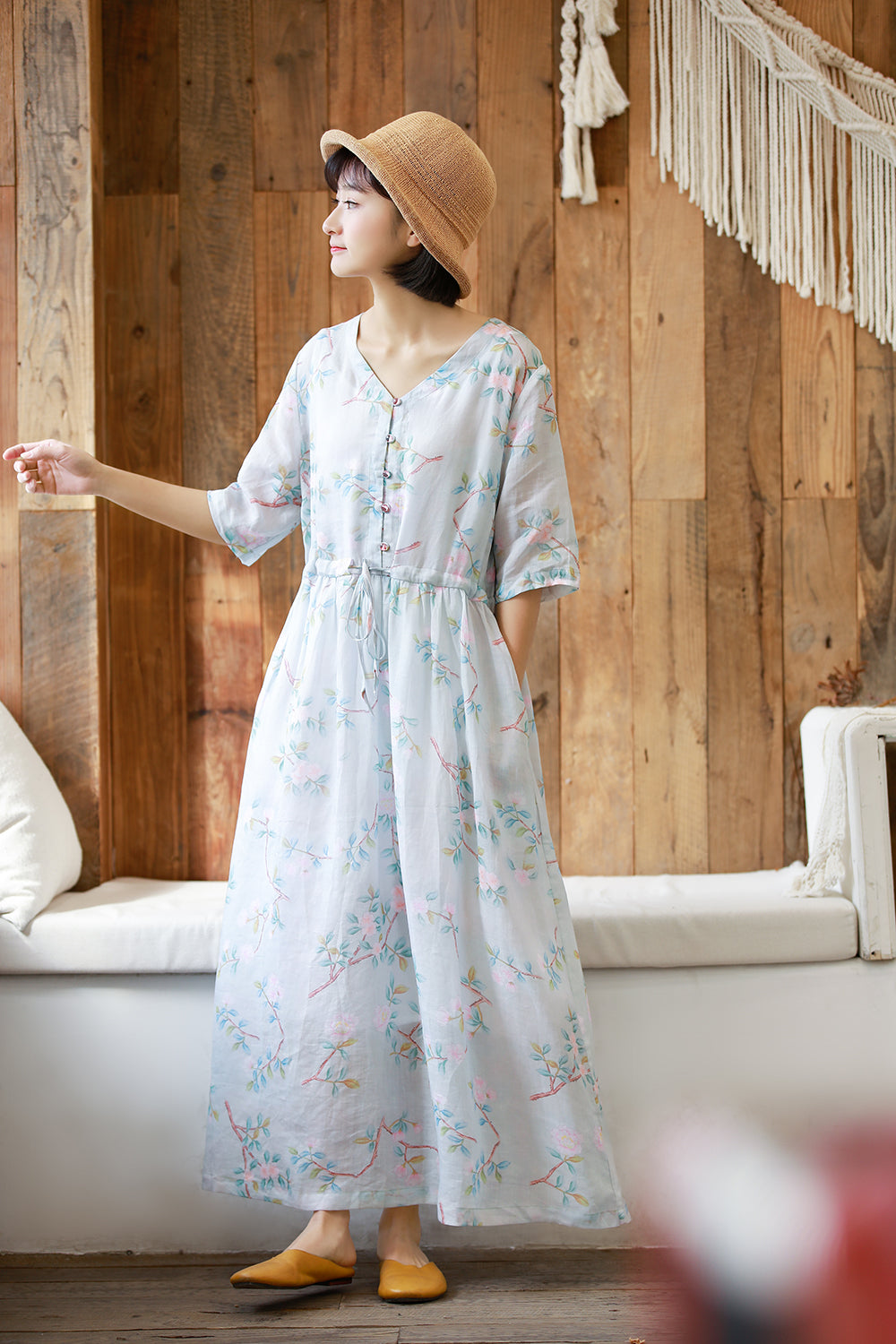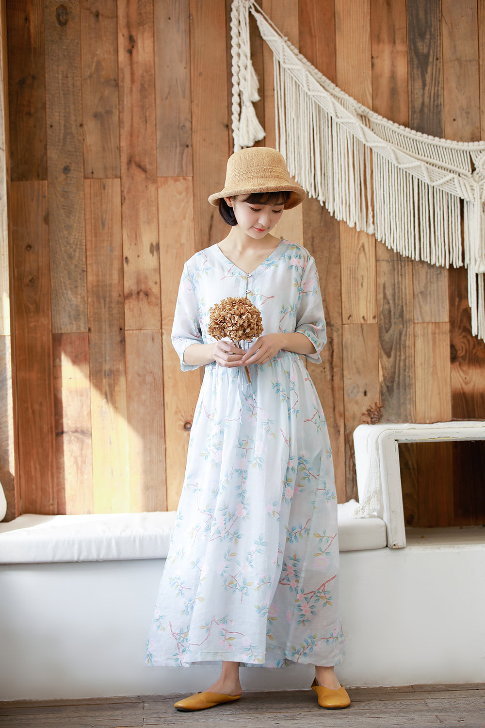 顏色:浅蓝尺碼:M/L面料:亞麻糢特身高:160cm體重:45kg